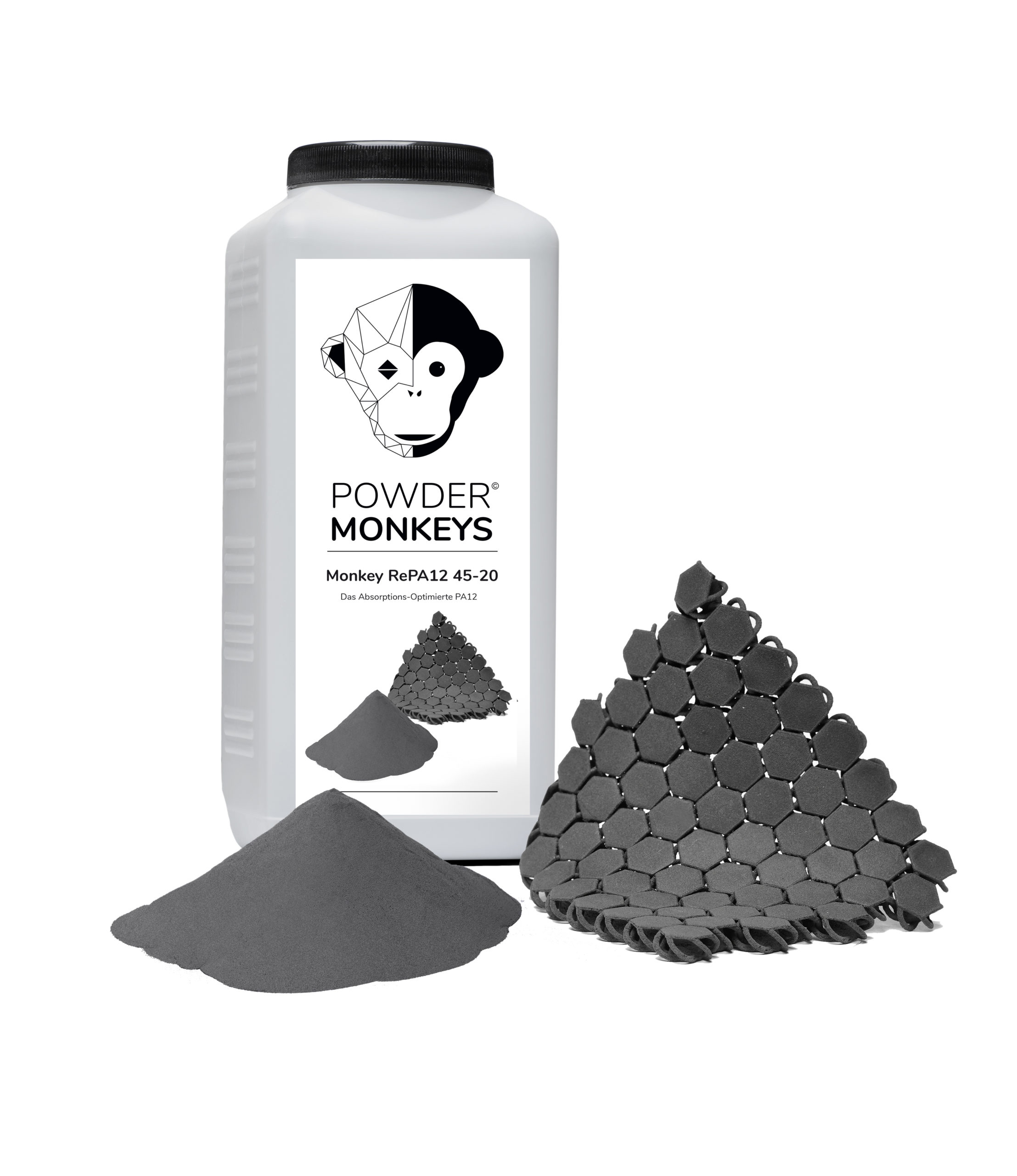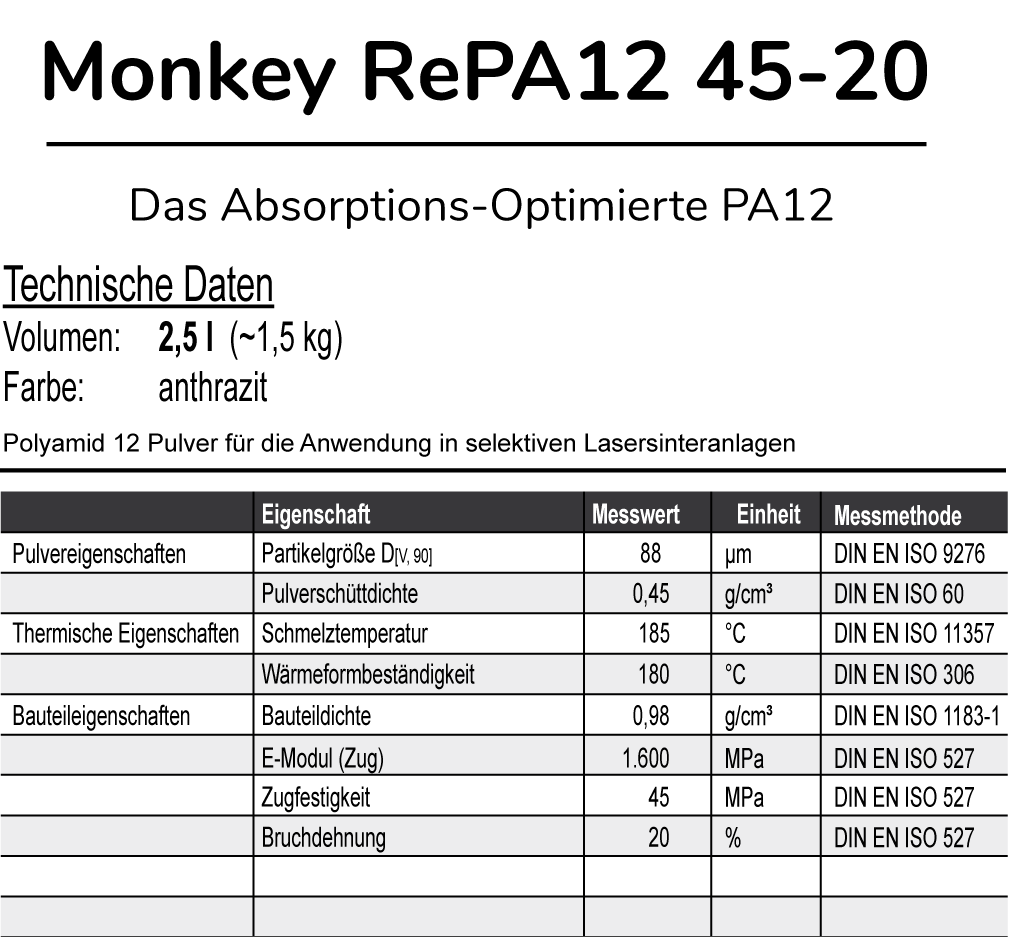 Alternativ zu den Neuwertigen SLS-Pulvern bieten wir auch ein speziell für SLS Kleingeräte optimiertes und speziell bei uns aufbereitetes PA12 – Pulver an; Monkey REPA 12 45-20. Hierbei handelt es sich um aufbereitetes PA12 Pulvermaterial, welches bei uns in einem eigens konzipierten Verfahren angepasst und optimiert wird, um beste Eigenschaften für SLS Kleingeräte zu ermöglichen. So können Sie auch Ihre kleinen SLS Anlagen wirtschaftlich betreiben und gleichzeitig einen positiven Beitrag zum Umweltschutz leisten.